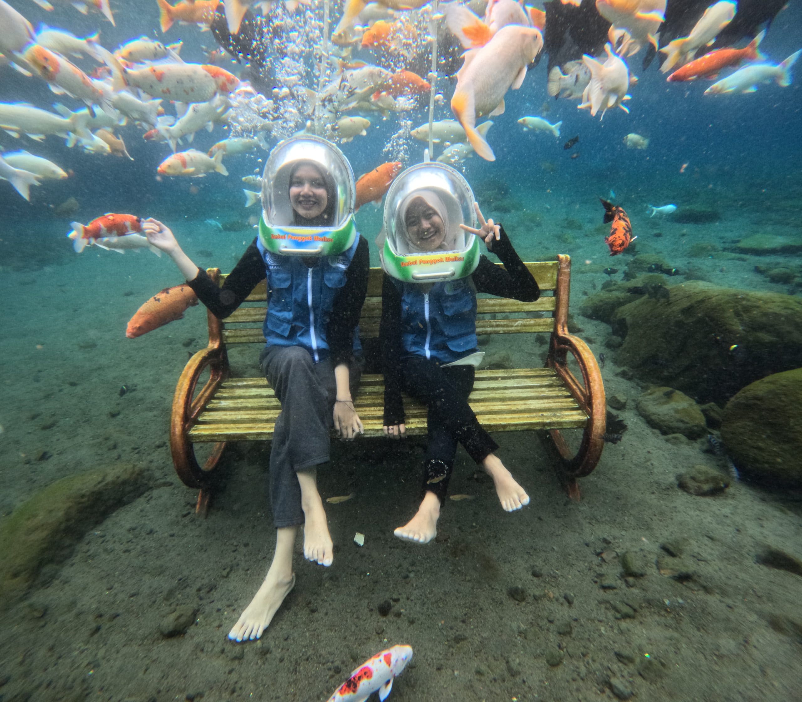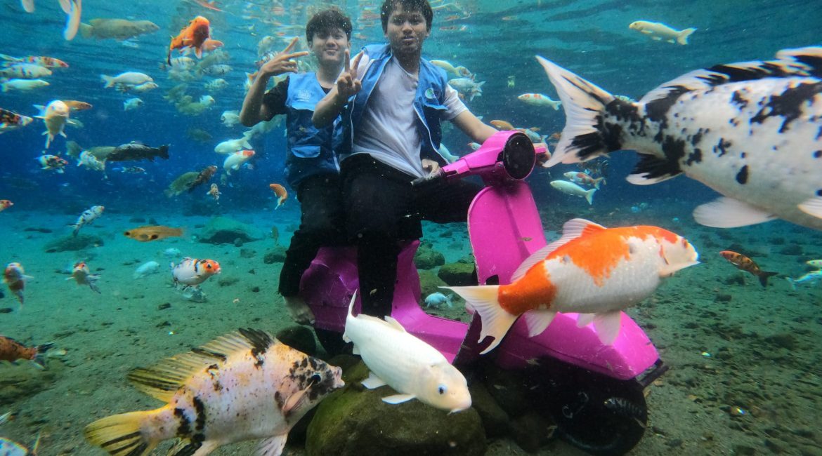 The main attractions of Umbul Ponggok include snorkeling, diving, underwater walker, and underwater photography. The large pool, which resembles a small lake, offers visitors the chance to swim freely while enjoying a unique underwater view filled with colorful fish. Many tourists also come specifically to take creative underwater photos with various props provided at the site. For those seeking more adventure, diving packages are available, while the underwater walker gives visitors the rare experience of walking on the pool’s bottom using special equipment.